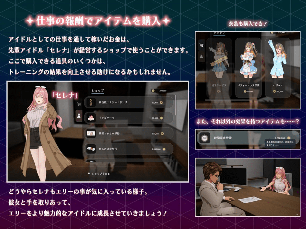 玩家作为经纪人,前往大学发掘了一位具有偶像潜力的新人「艾莉」。